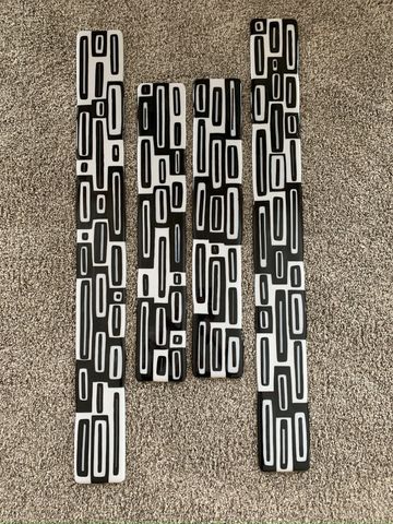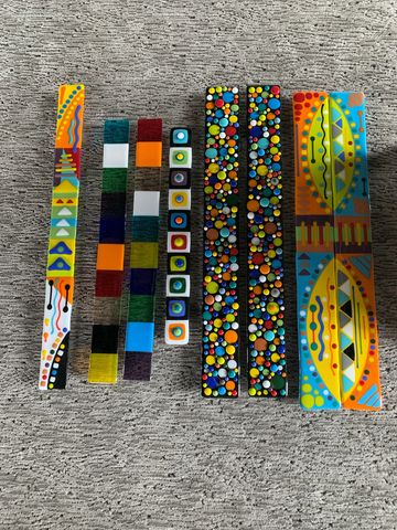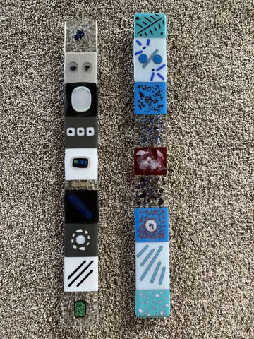 Start with a piece of clear glass cut to the size of your project. Next, you'll add another layer of glass by cutting squares or rectangles from the available colored sheet glass. After that, you can embellish it to your liking using various materials. Each bar comes ready to hang with a D-hook for easy hanging. Bar pricing varies by design — quotes available upon request. Final cost depends on size, detail, and glass selection.